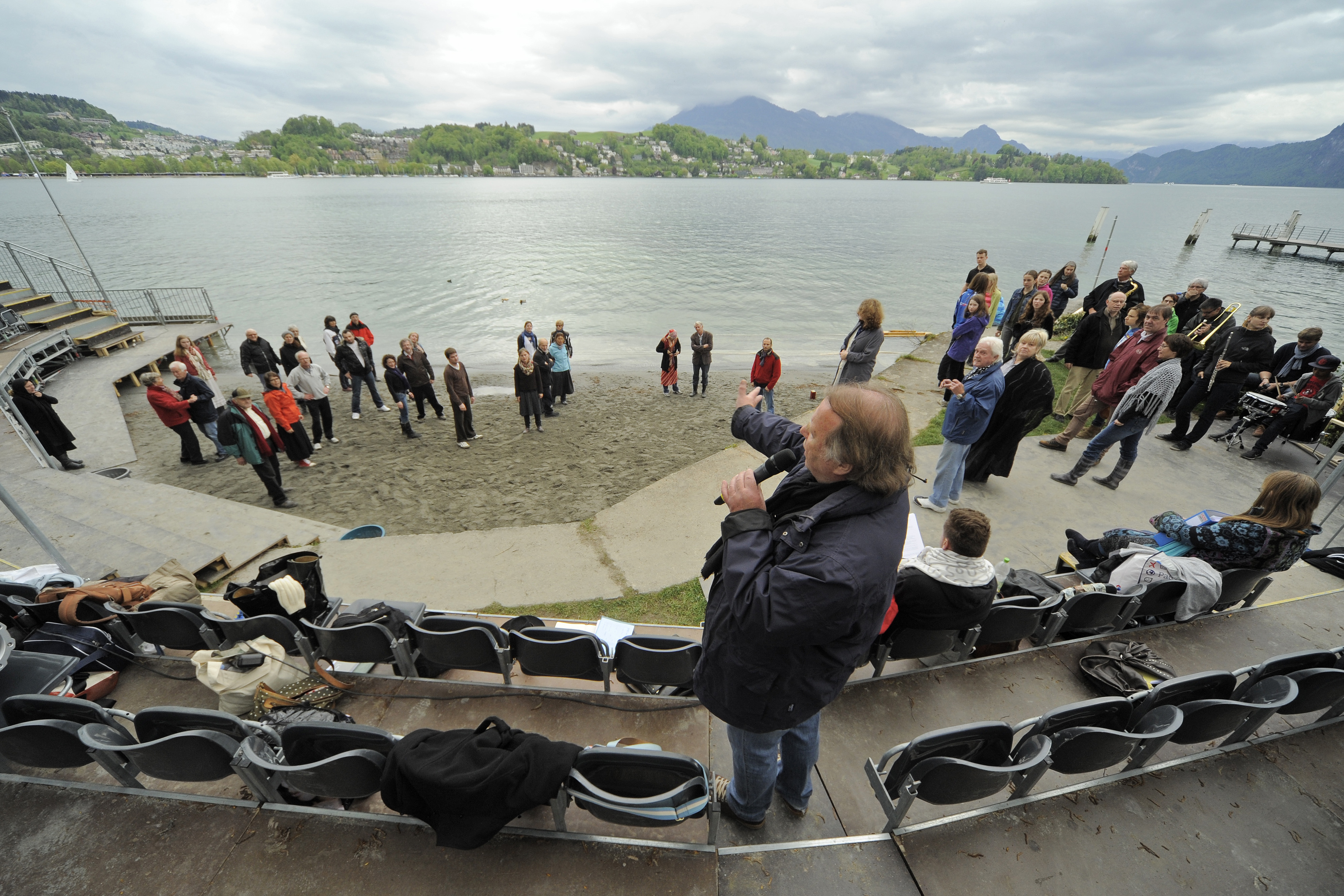 Am vergangenen Samstag lud der Verein Luzerner Freilichtspiele zur traditionellen Kick-off-Veranstaltung auf die Seebühne. Neben den über 60 Darstellern, dem Kreativ- und Produktionsteam kamen auch viele Backstage-Helfer. Hesse betonte in seiner Rede an die Mitwirkenden, dass er an der Arbeit mit Laienspielern vor allem die „vielen verschiedenen Persönlichkeiten“ schätzt. Mit Vorfreude blickte er auf die kommenden fünf
