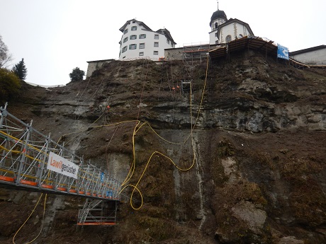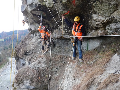 Nach dem Einbau der Anker, erfolgt die Installation der Netzabdeckung im oberen Teil der Felswand. Sobald die oberen Wandbereiche gesichert sind, kann am Fusse der Felswand mit dem Abbau des labilen Felspfeilers und der Ufersicherung begonnen werden. Parallel dazu erfolgt die Sicherung der überhängenden Felspartien durch Betonkonsolen.