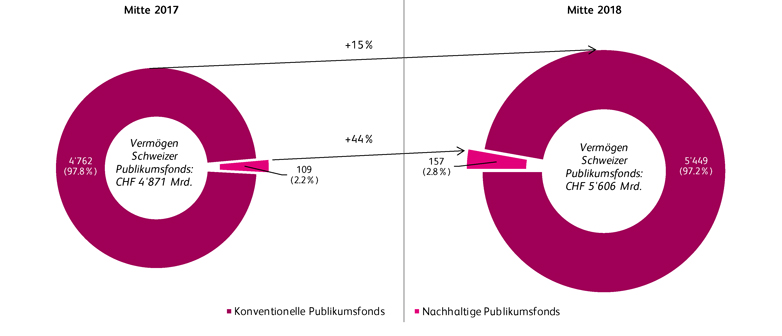 Die Vermögen nachhaltiger Publikumsfonds im Schweizer Vertrieb sind über das vergangene Jahr um 44 Prozent auf 157 Milliarden Franken gestiegen. Damit sind nachhaltige Investmentfonds prozentual dreimal so schnell wie der Gesamtmarkt gewachsen. Das zeigt die «IFZ Sustainable Investments Studie 2018» der Hochschule Luzern. Schweizer Anlegern stehen heute 423 Fonds zur Verfügung, die neben finanziellen Kriterien auch solche der Sozial- und Umweltverträglichkeit berücksichtigen. Nachhaltige Anlagen gelten als erfolgreiche Innovation und erreichen eine immer breitere Investorenbasis: Die Anzahl an nachhaltigen Publikumsfonds steigt im Vergleich zum Vorjahr von 336 auf 423 Fonds (+26 Prozent). Die darin verwalteten Vermögen wachsen von 109 auf 157 Milliarden Franken (+44 Prozent, siehe Abbildung). Das zeigt eine Studie des Instituts für Finanzdienstleitungen Zug IFZ der Hochschule Luzern, die nachhaltige Investmentfonds mit öffentlicher Vertriebszulassung in der Schweiz analysiert.
