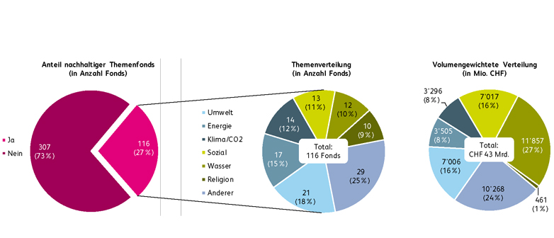 27 Prozent der nachhaltigen Publikumsfonds investiert in ein nachhaltigkeitsrelevantes Thema wie etwa Klima, Umwelt, Energie oder Soziales (siehe Abbildung). «Themenfonds greifen meist zeitgenössische Debatten auf, gegenwärtig Umweltthemen wie den Klimawandel oder soziale Herausforderungen wie den demographischen Wandel», sagt Studienleiter Manfred Stüttgen. Themenfonds mit einem Fokus auf Umwelt und Klima wachsen überproportional. Sie profitieren von der Nachfrage nach grünen Obligationen (Green Bonds). Diesen Fonds sind über 1 Milliarde Franken Neugeld zugeflossen. Auch das Angebot an Fonds mit einem sozialen Thema wie Demographie, Generationengerechtigkeit oder Geschlechterdiversität wird breiter. Diese Fonds sind im Vergleich zu anderen Themenfonds (z. B. Wasser) noch relativ jung.