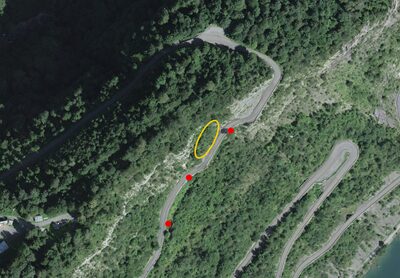 Sicherungsarbeiten (gelber Kreis) und das Erstellen von Versuchsankern (rote Punkte) an der Isenthalerstrasse haben Nachtsperrungen zur Folge. Bild Baudirektion Uri