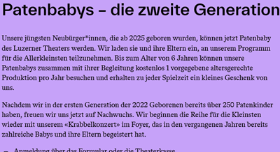 Anmeldung 2025 geborener Kinder als Patenbaby unter: luzernertheater.ch/patenbabys
