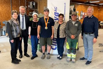 hrung des Schweizermeisters: (von links) Yvonne Slongo, Vorsteherin Amt für Berufsbildung, Regierungsrat Georg Simmen, Karin Gaiser, Armin Gaiser, Theres Arnold, Roman Gaiser und Thomas Walker, Geschäftsleitung Clima-Nova AG.
